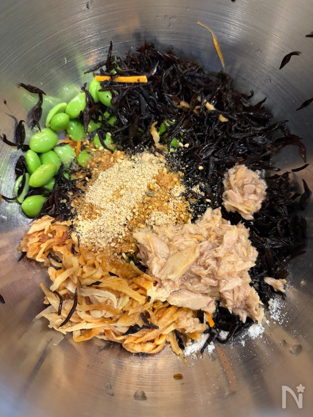 (1) ボウルに切り干し大根、ひじき、ツナ缶、人参、枝豆【A】を入れて混ぜ合わせる。