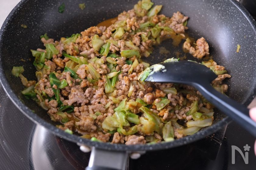 事前に「できちゃうV冷凍+」に設定しておいた冷凍室からキャベツを取り出し、1〜2cm程の大きさになるように手で砕いたら、フライパンに加えてさらに2分ほど炒める。