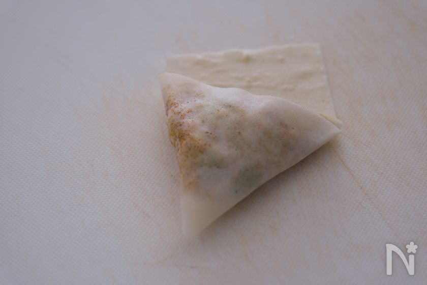 (3) 春巻きの皮を3等分に切ったら、2を端にのせて三角形になるように包む。