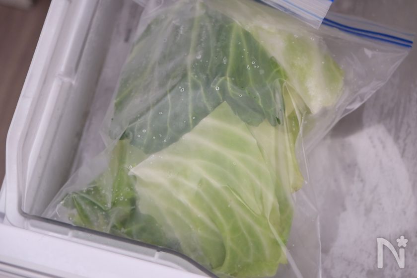 (下準備) キャベツは大きめのざく切りにしたら、冷凍用保存袋に入れて冷凍しておく。冷凍する際に「できちゃうV冷凍+」に設定しておく。