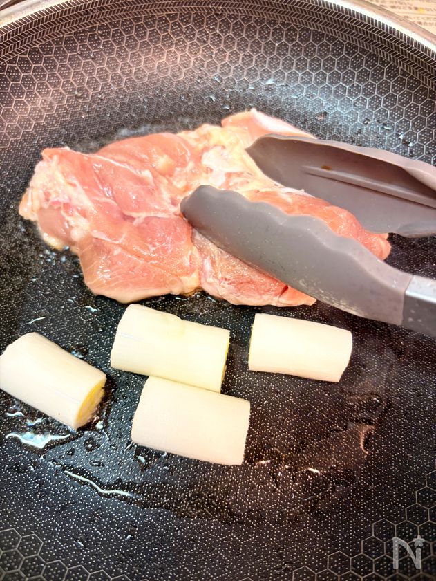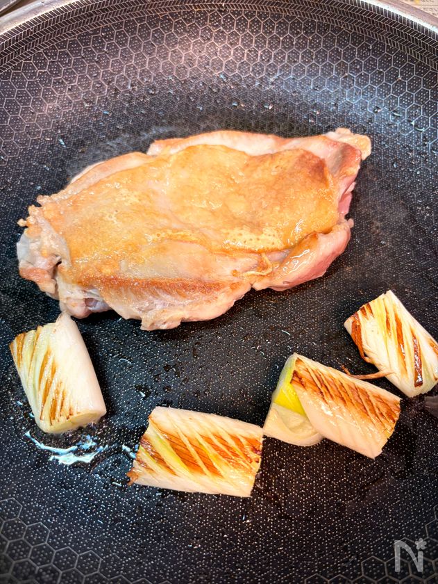 (3) 鶏もも肉とねぎに焼き目がついたら裏返し弱火で4~5分蓋をして蒸し焼く。