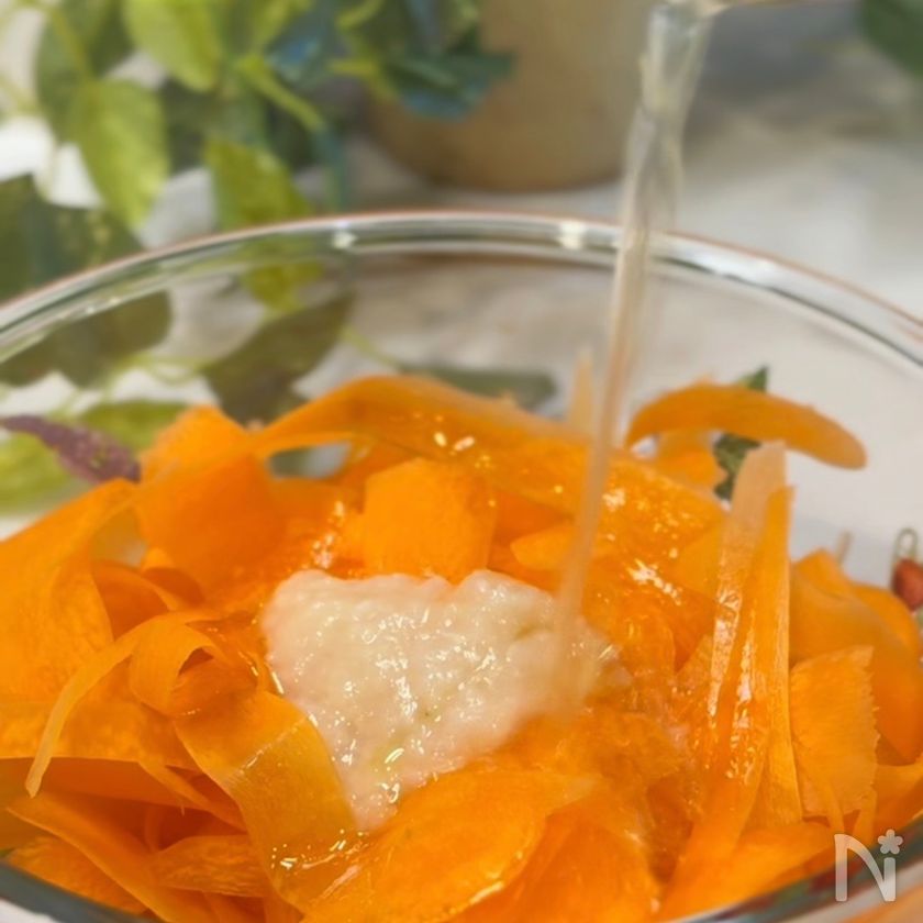 (2) にんじんと【A】を混ぜて全体を和え、5分ほど置いたら出てきた水分を軽くきる。