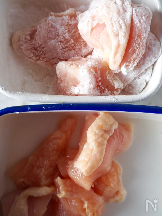 (4) 鶏肉のまわりに片栗粉をまぶす。