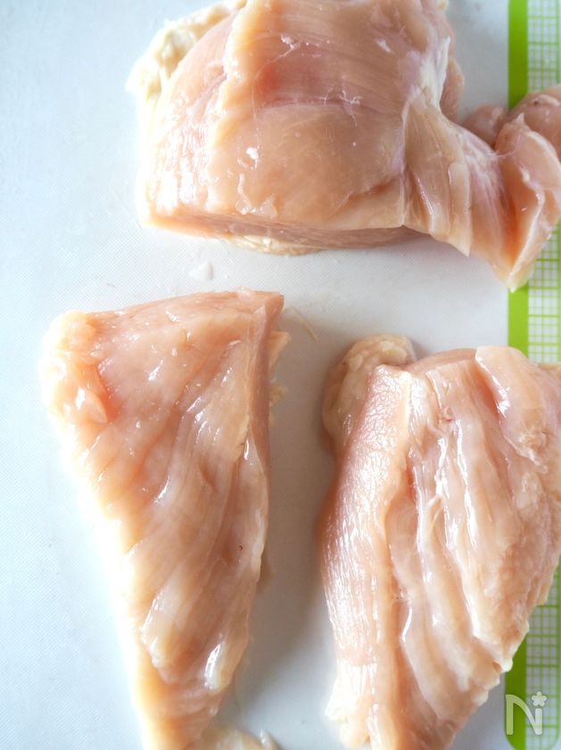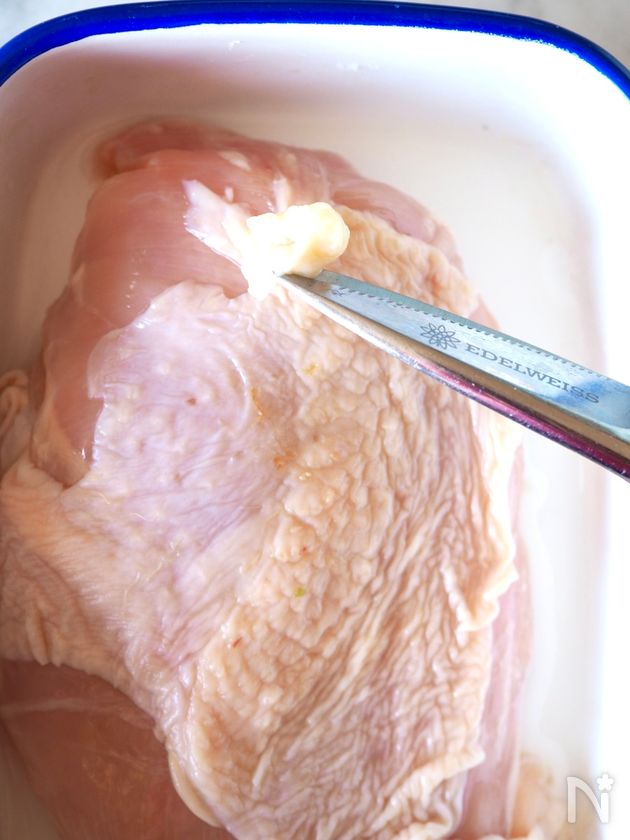(下準備) 鶏むね肉は皮目にフォークなどで数カ所穴を刺し、黄色い脂肪や筋などをキッチンバサミで切る。