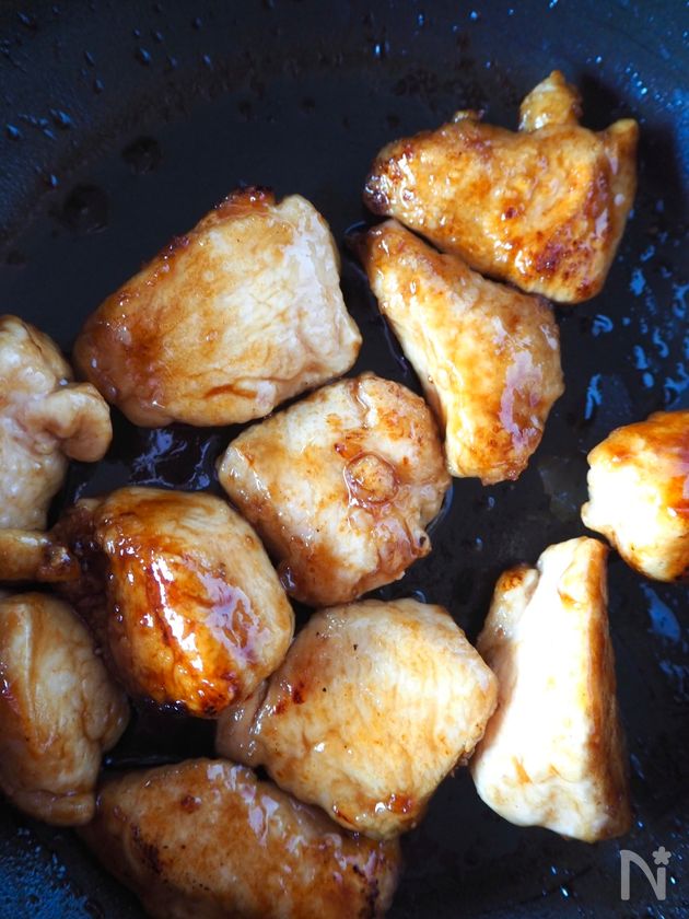 (5) フライパンにサラダ油を中温に熱し、鶏肉を両面こんがり焦げ目がつくまで焼いて【B】を加えて味を絡める。