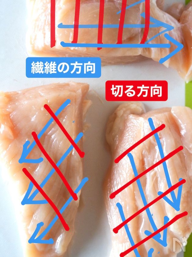 (2) それぞれの部位で繊維を断ち切るように、上の部分は縦に、下は繊維を断ち切るようにそぎ切りする。
