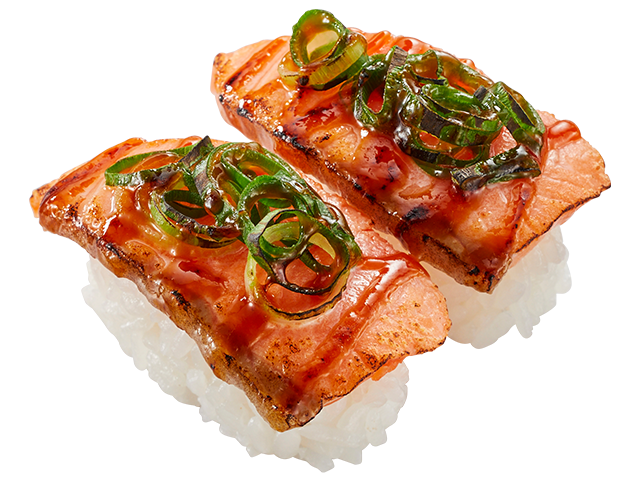 人気のサーモンに、青ねぎとちゃんちゃん焼きのタレを乗せて直火炙りにしました。