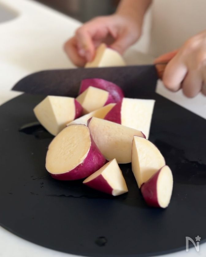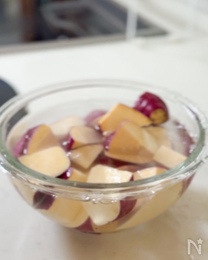 (3) 耐熱ボウルにさつまいもと大さじ1の水を加え(分量外)
