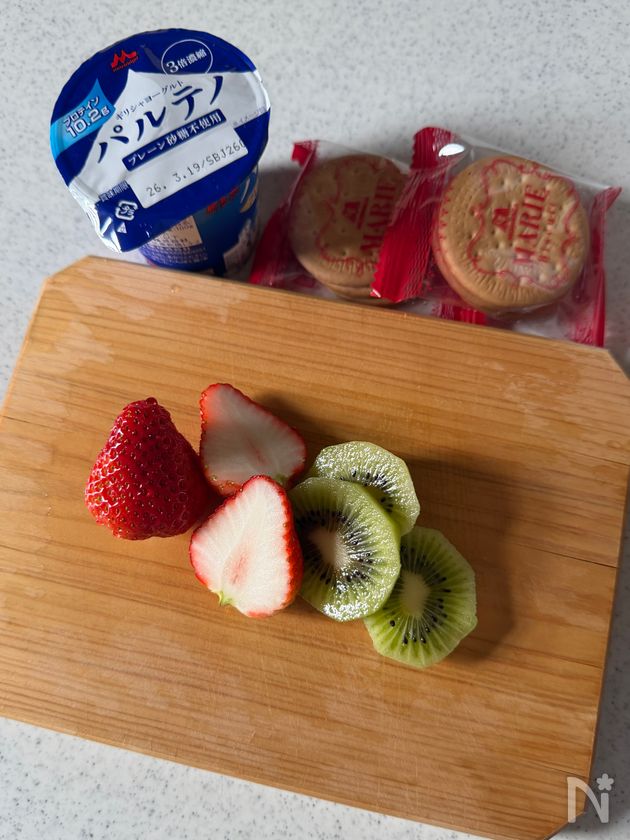 いちごは半分に、キウイは3枚ほどにスライスする。ビスケット(市販)は半分程度に割る。