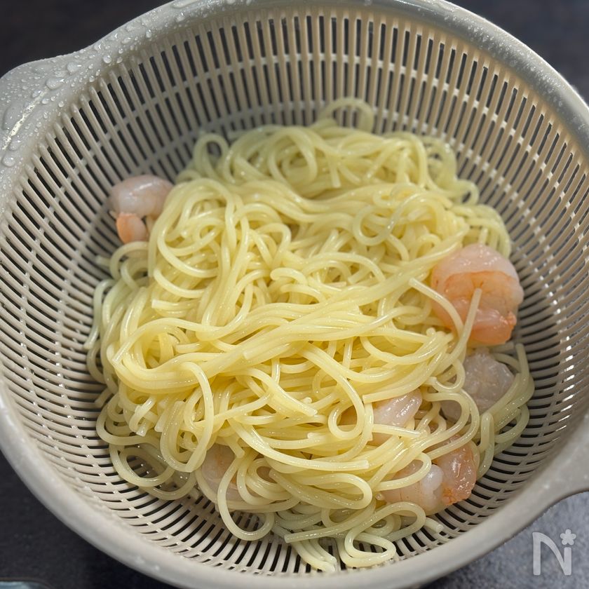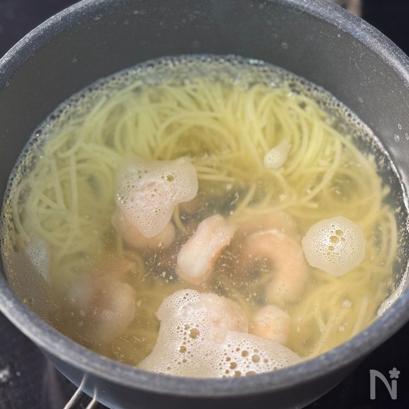 (1) 鍋に湯1Lを沸かし、塩を加えてスパゲティを茹でる。茹で上がりの1分前にむき海老を加えて一緒に茹でる。