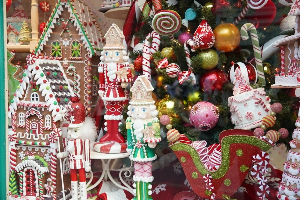 ワールドバザールのショーウィンドウは、クリスマスになると一気にホリデームードに。少し引きで撮ることで、装飾全体が写り、海外の街角のような雰囲気の写真が撮れます。