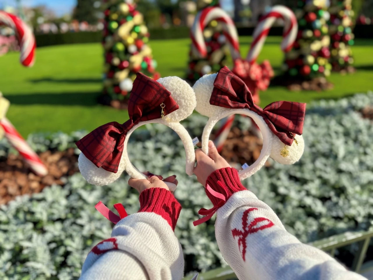 パーク内には、カチューシャの雰囲気にぴったり合う景色がたくさんあるので、デコレーションや建物を背景に切り取って撮るのも◎。カチューシャと手を使ってハートマークを作るのも、定番ながらかわいい撮り方です。