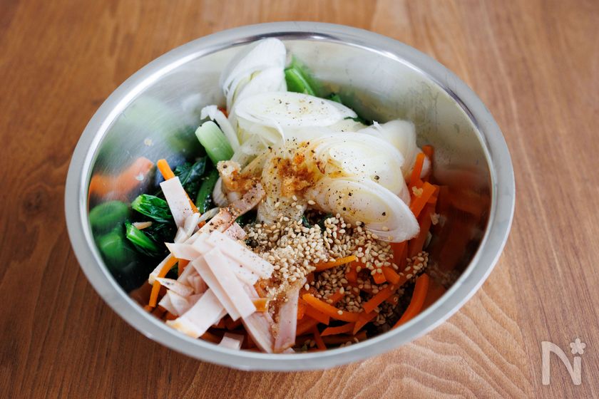 (2) ボウルに小松菜とにんじん、長ねぎ、ハム、【A】を入れてよく和える。
