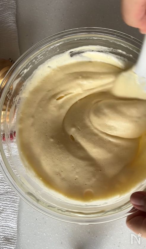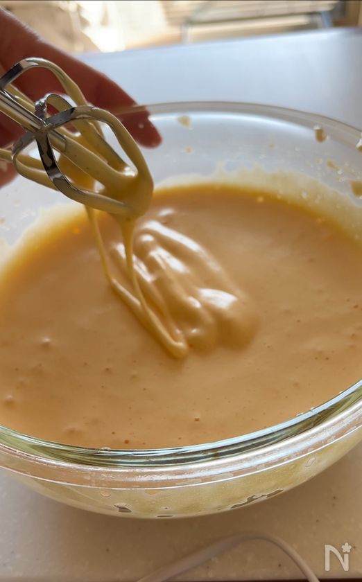 (ふんわり白っぽくなりキメが細かくなるまで。生地を持ち上げて垂らしたときにリボン状の跡がゆっくり消えるぐらいがベストです!)