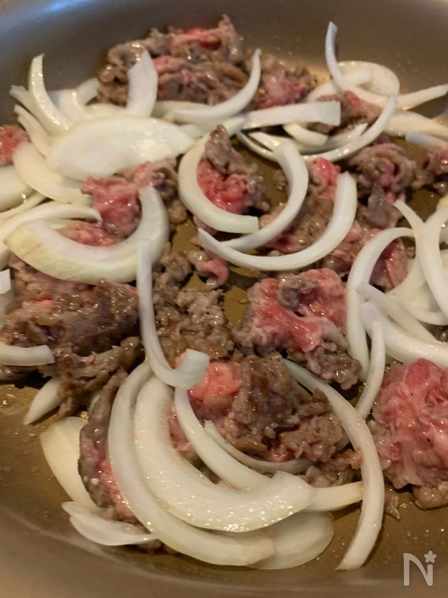 (1) フライパンにごま油を入れて火をつけ、牛切り落とし肉を炒める。色が変わってきたら玉ねぎを加え炒める。