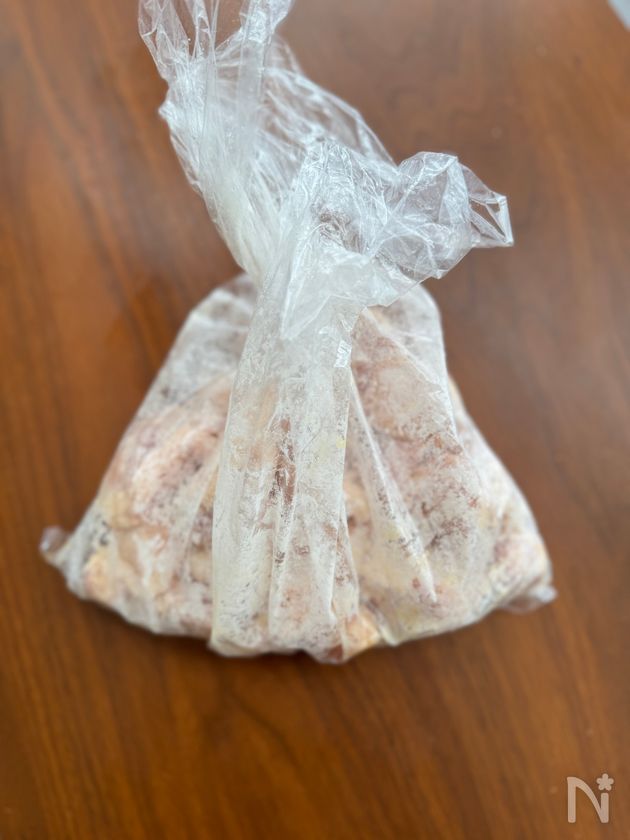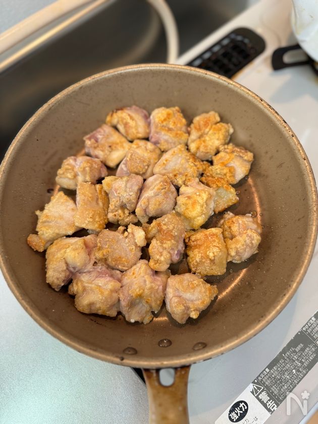 (1) 鶏もも肉は一口大に切る。【A】をもみこみ薄力粉をまぶす。