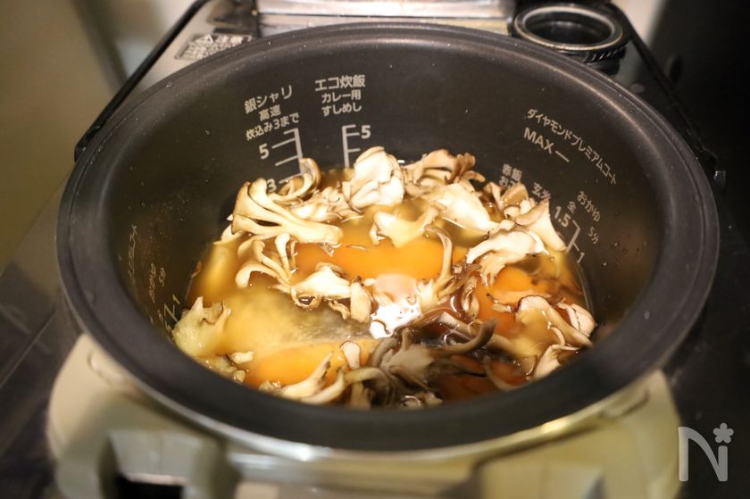 (2) 塩鮭、まいたけをのせ、通常炊飯する。