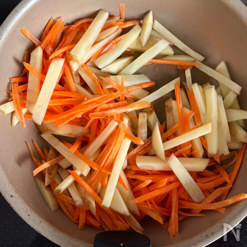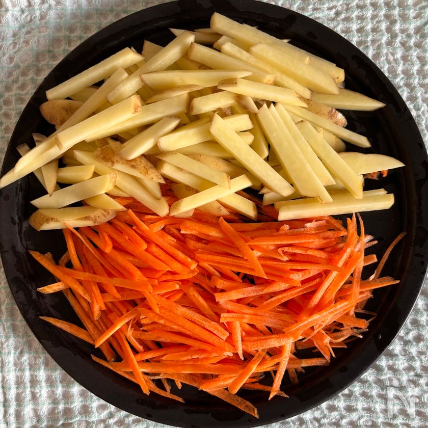(下準備) じゃがいも、人参はそれぞれ細切りにし、耐熱皿に乗せて600wで2分加熱する。