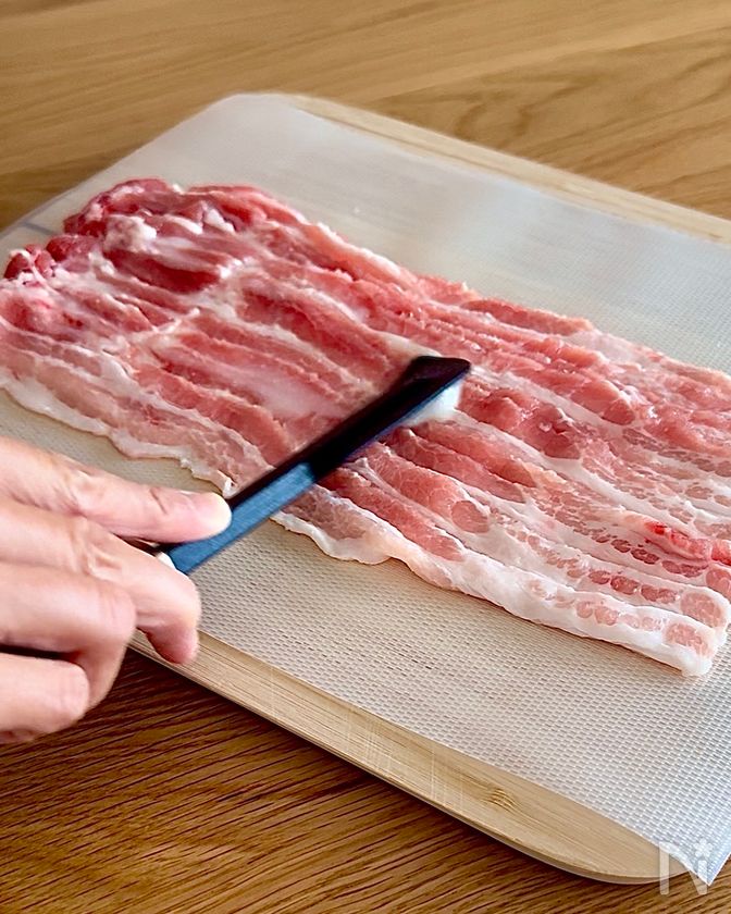 (1) 豚バラ薄切り肉を2等分し、それぞれをパックの形のまま広げる。内側に塩麹(小さじ1ずつ)をうすく塗る。