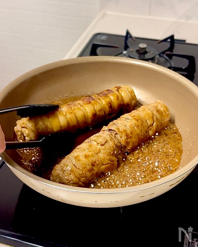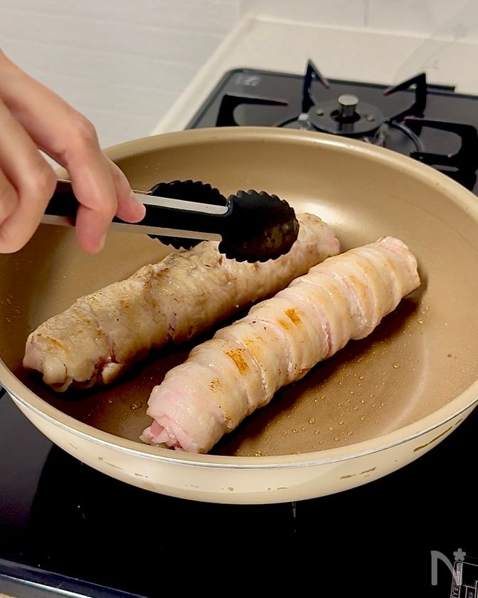 (4) フライパンにサラダ油を中火で熱し、2本を転がしながら全体にこんがり焼き色をつける。