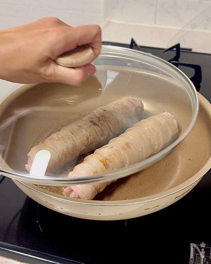 (5) 水(分量外:大さじ2)を加えて蓋をし、弱めの中火で5〜6分蒸し焼きにする。