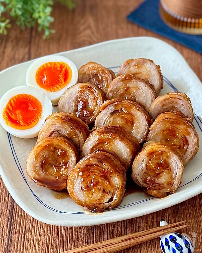 ・仕上げにタレを煮からめることで、香ばしさとツヤのある仕上がりに。ゆで卵を添えると彩りもよく、タレとの相性も抜群です♩