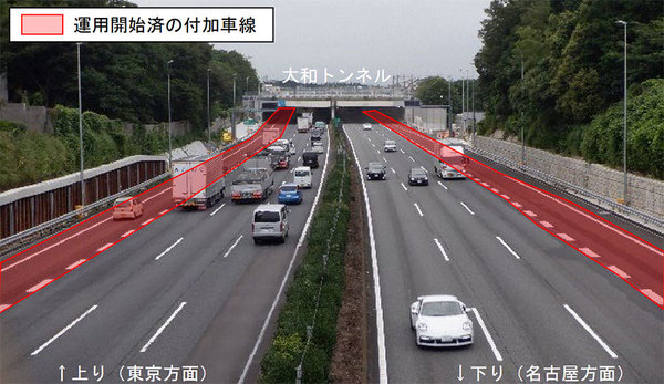 東名上り線、大和トンネルを先頭とする渋滞は、付加車線ができたことで解消されたという(画像:NEXCO中日本)。