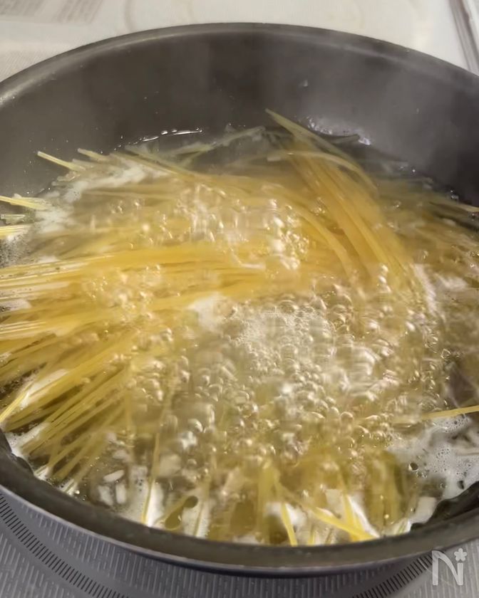 (3) 沸騰したら、パスタを入れて、表記時間+3分茹でる。