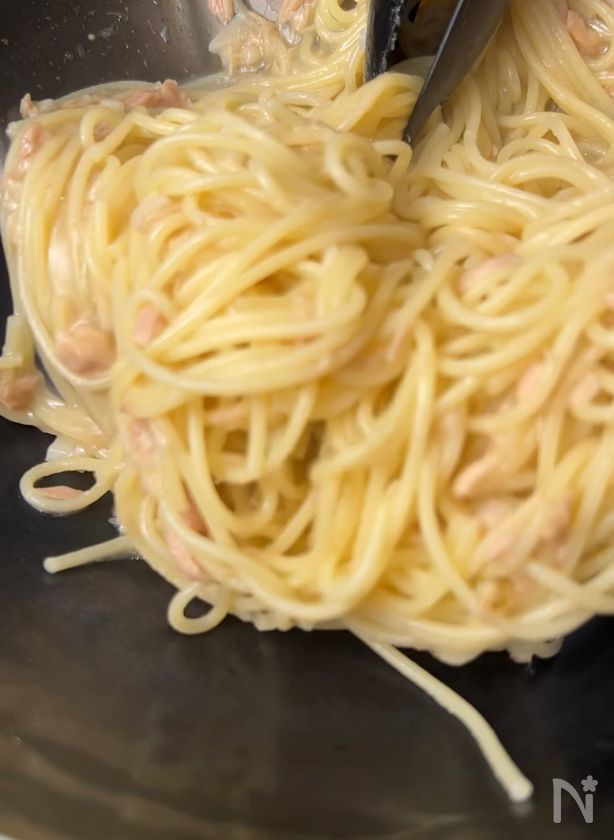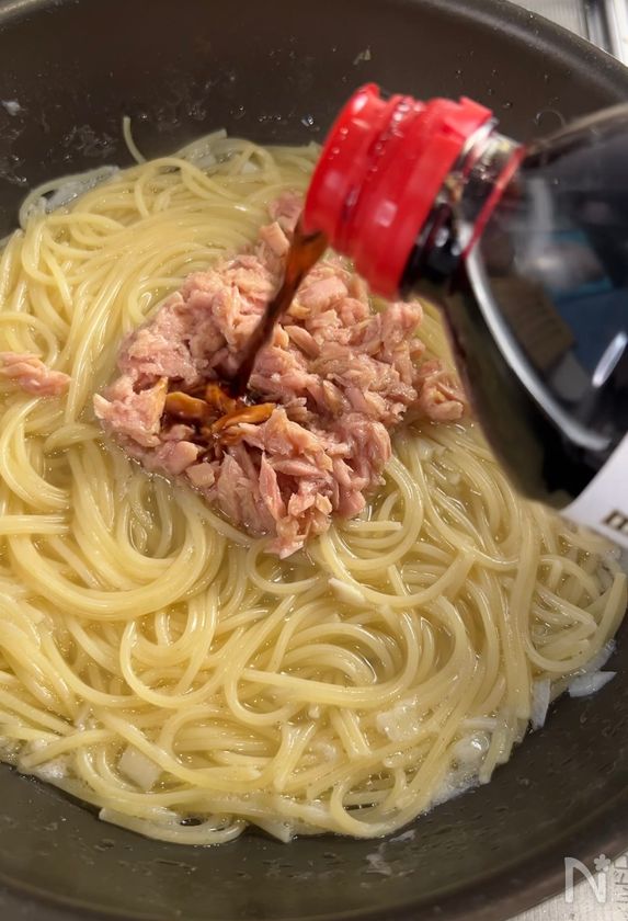 白だしを使うことで、うま味を吸ったパスタになる。