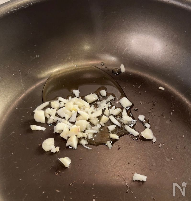 (1) フライパンに油をひき、にんにくを入れて、中火にかける。