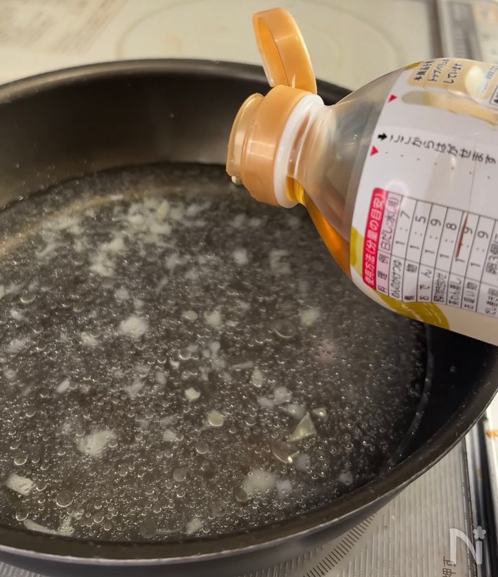 (2) にんにくの乖離が出てきたら、【A】を入れて、強火にかける。