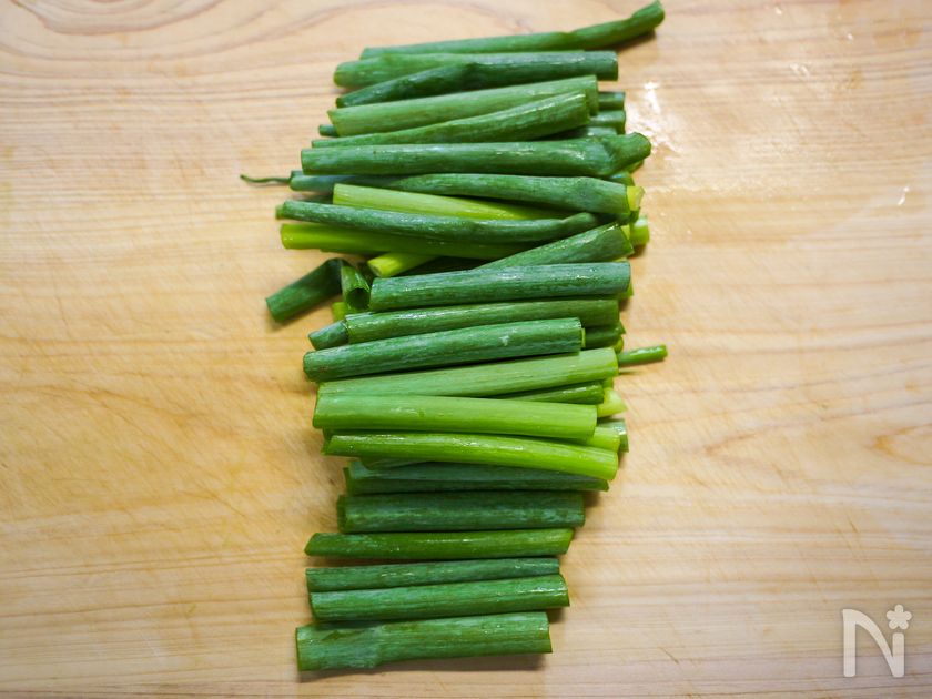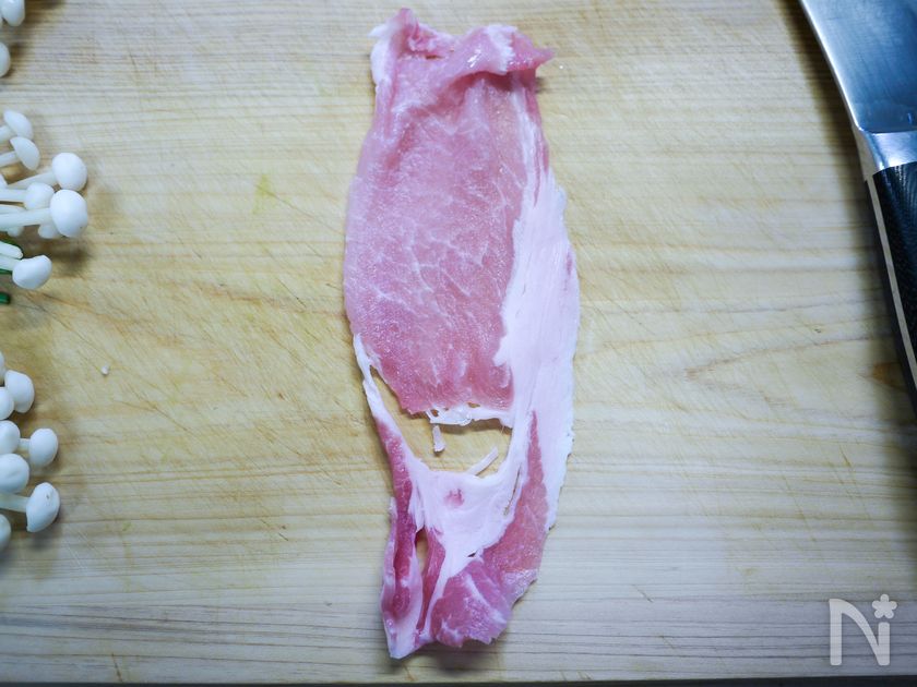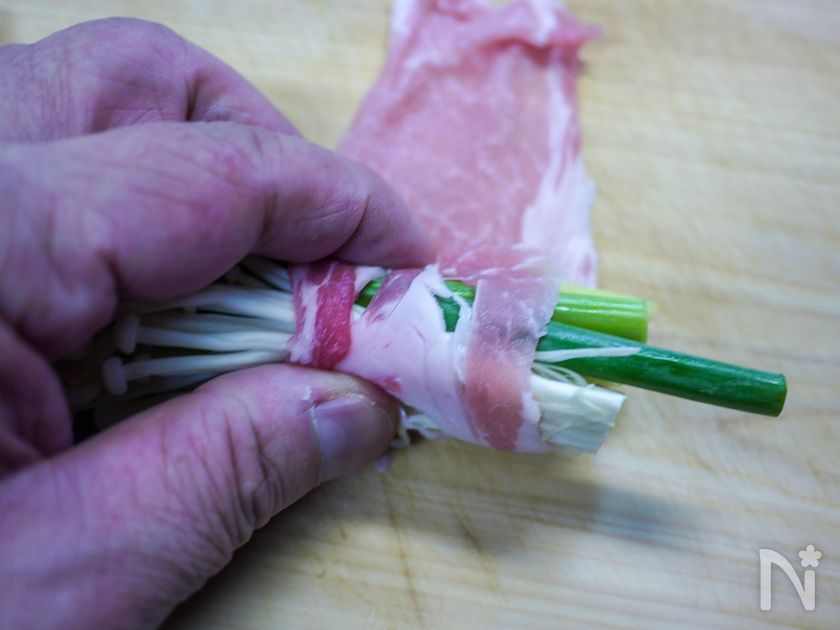 (3) 適量の万能ねぎと根の部分を切ったえのきを乗せて