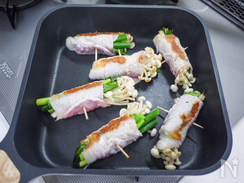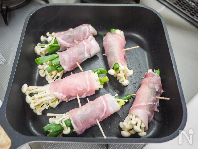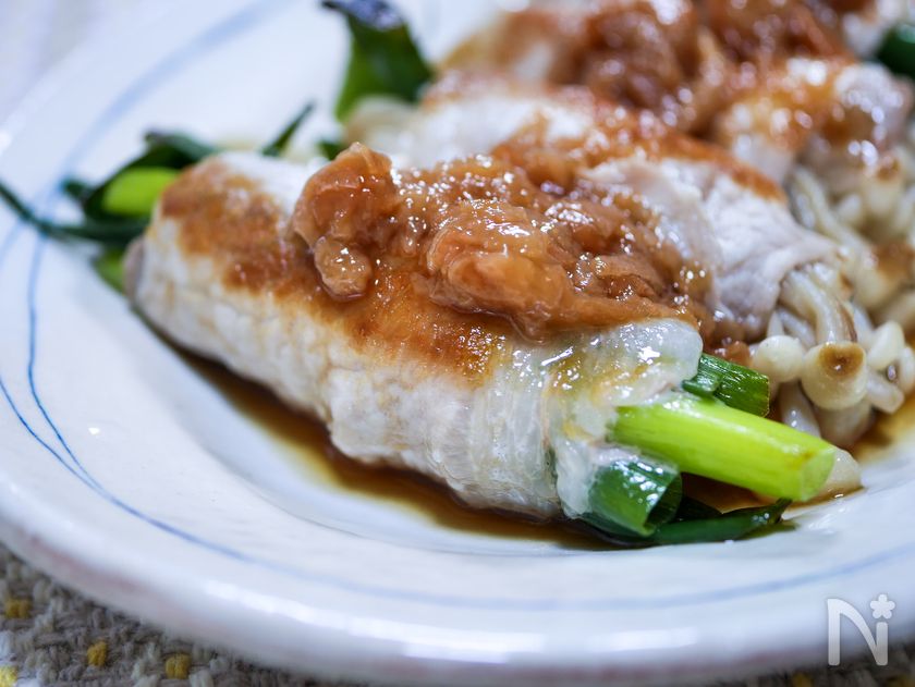 えのきとネギの豚肉巻き焼き(梅肉ポン酢かけ)