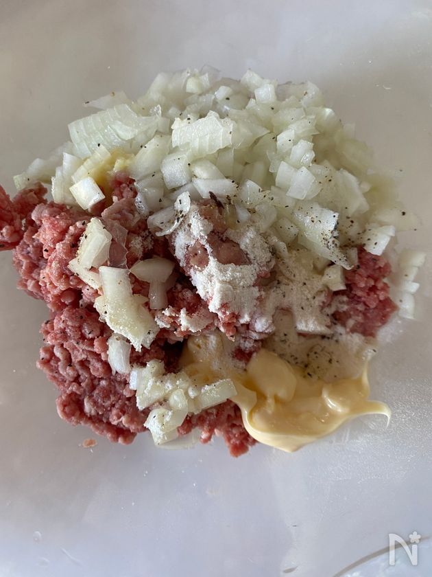 (1) 玉ねぎはみじん切りにする。ボウルに豚ひき肉、【A】とともに入れて、粘りけが出るまでよく捏ねる。