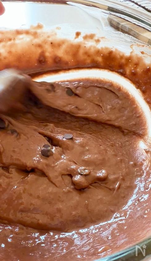 (3) 【C】を加えてよく混ぜ、【D】を加えてさっくり混ぜる。(チョコチップは上に飾る用を少し残しておく)