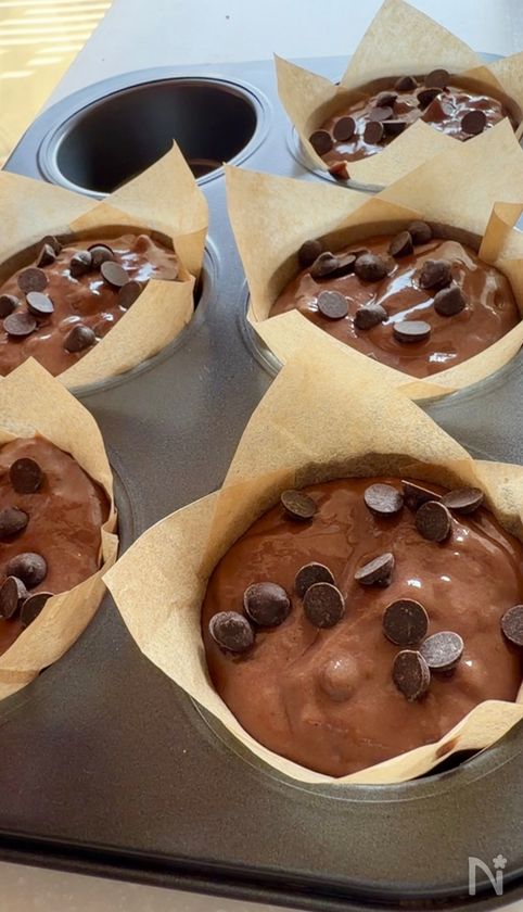 (4) 敷紙をしいたマフィン型に生地を入れ、上にチョコチップを乗せる。