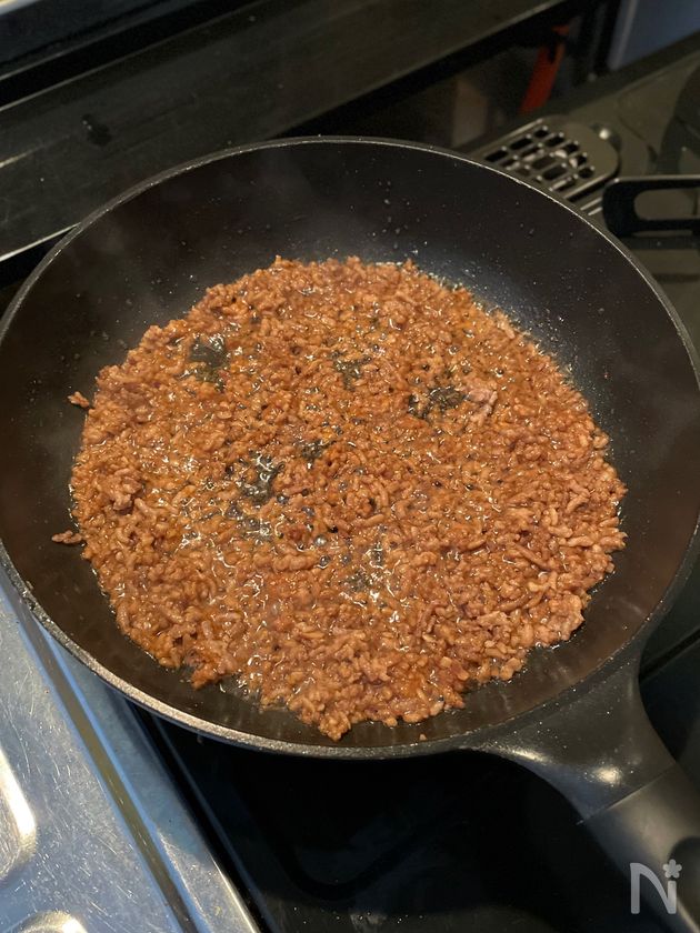 (2) 中火に熱したフライパンで豚ひき肉を炒め、色が変わってきたら【A】を加えて2分ほど炒める。