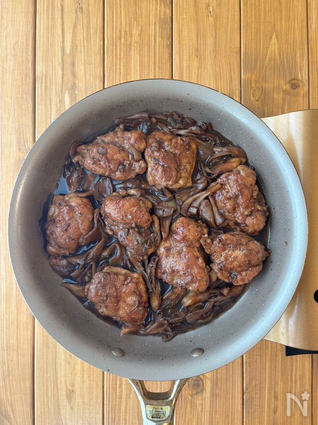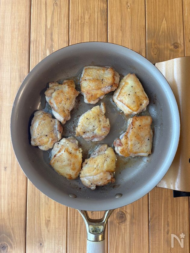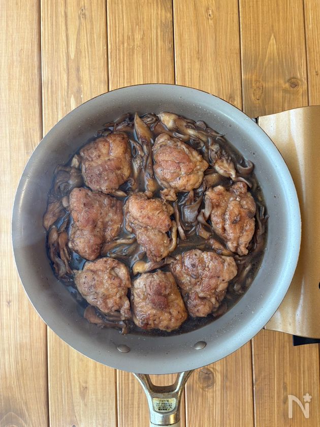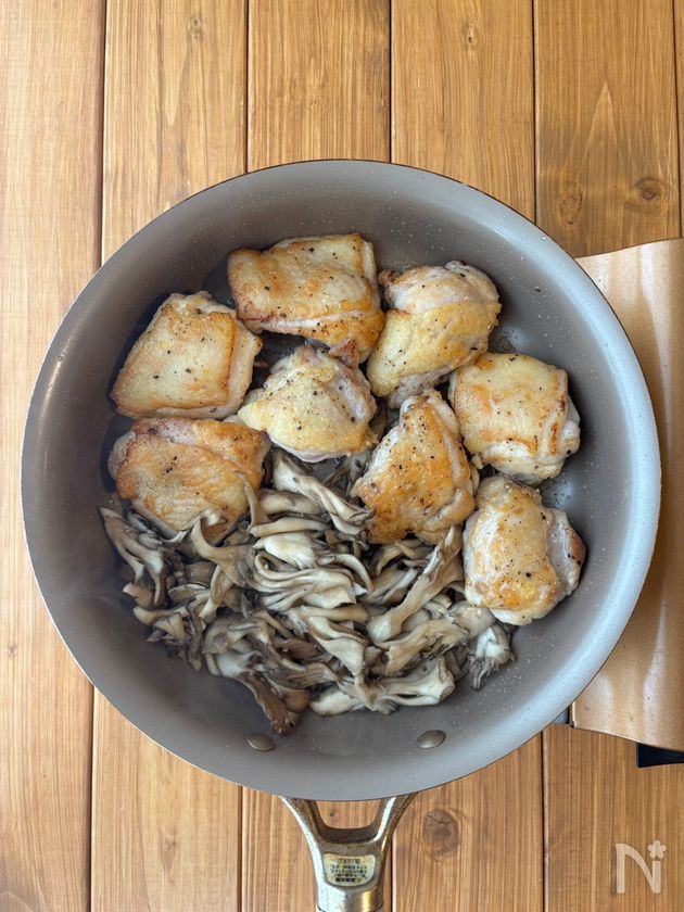 工程3では鶏もも肉とまいたけには完全に火が通ってなくても大丈夫です。