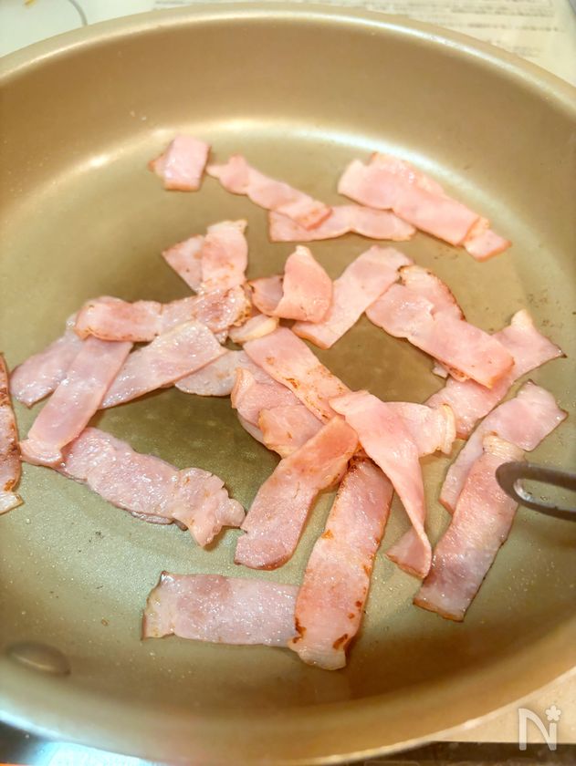 (1) ハーフベーコンは1㎝幅に切りフライパンで3分じっくり弱火で焼く。
