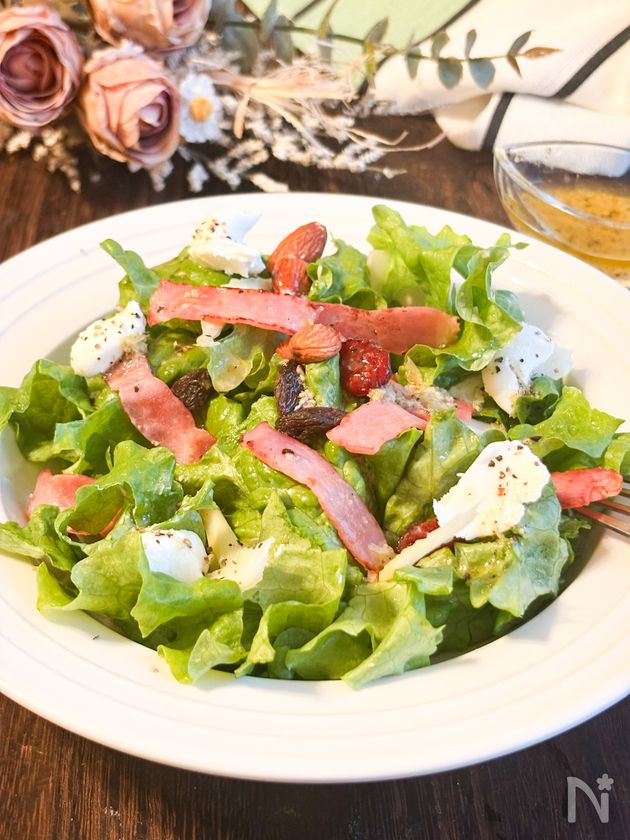 わさびドレッシング♪カリカリベーコンのレタスナッツサラダ
