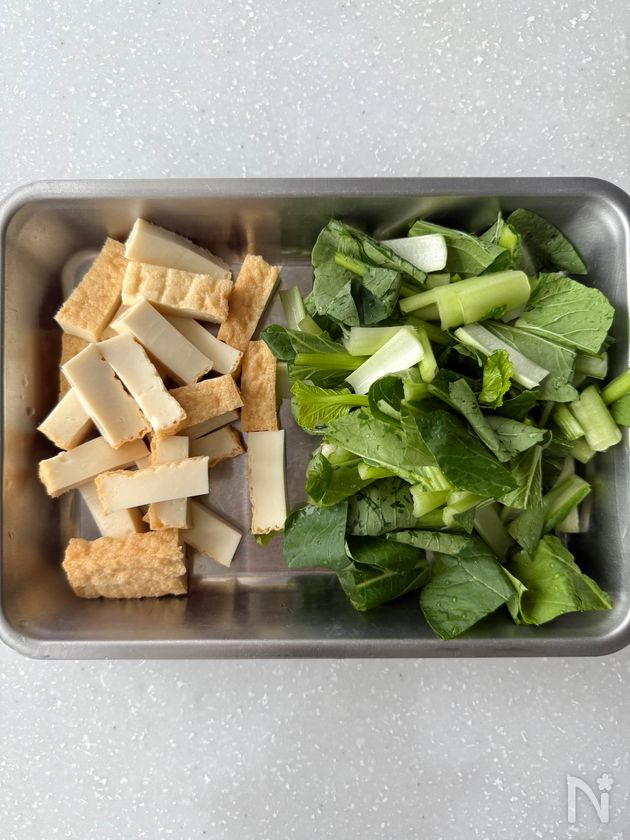 厚揚げは表面の油をペーパータオルで軽く押さえてから、1cm幅の棒状に切る。