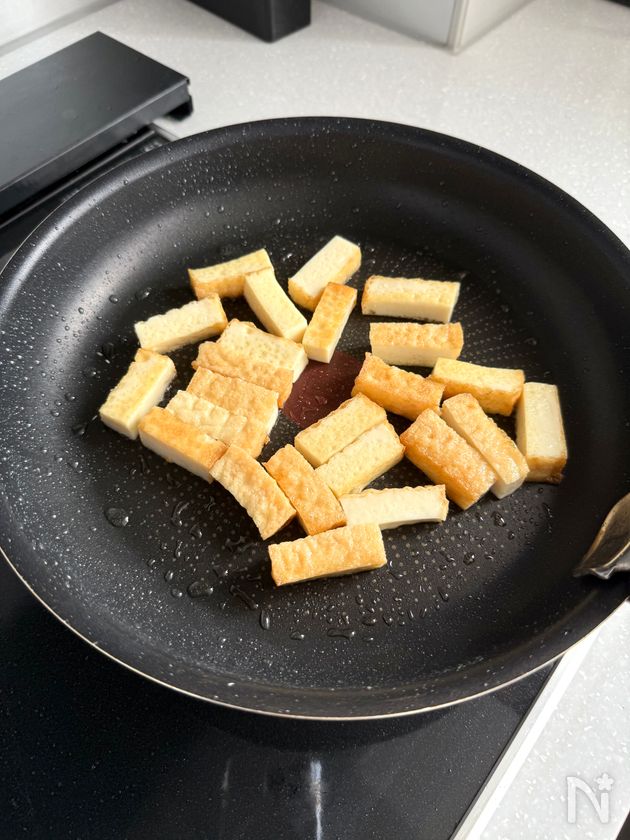 (2) フライパンにごま油を中火で熱し、厚揚げを入れて全体に焼き色をつける。