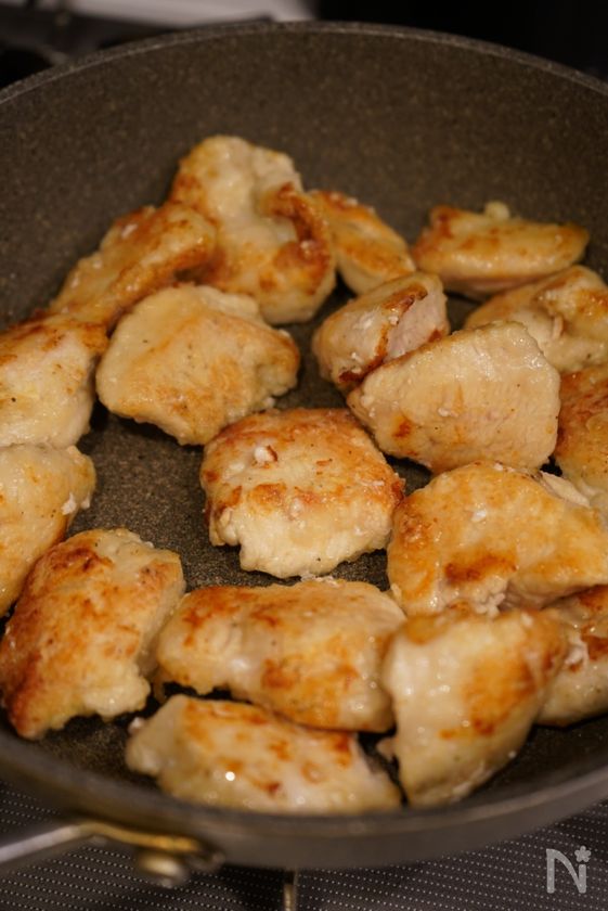 フライパンにサラダ油を入れて火をつけて胸肉を焼く。