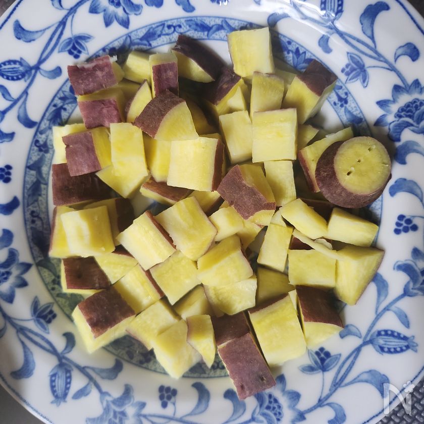 (2) さつまいもはよく洗い、1㎝角の角切りにする(気持ち大き目でOk)。5分程水にさらし、水気を切る。