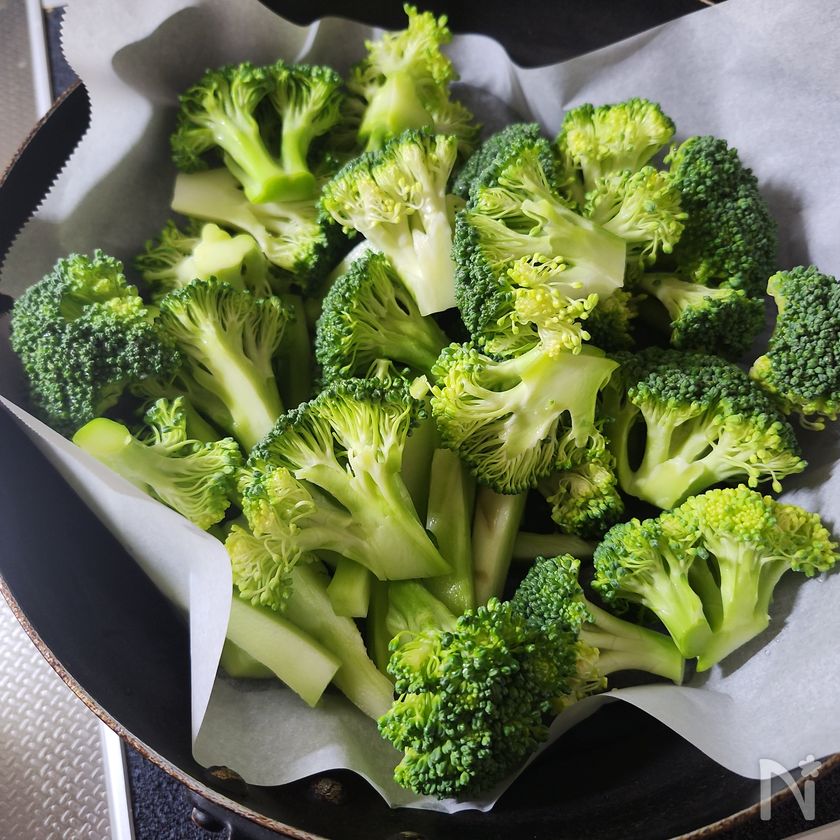 (3) フライパンにクッキングシートを敷き、その上にブロッコリーを乗せる。