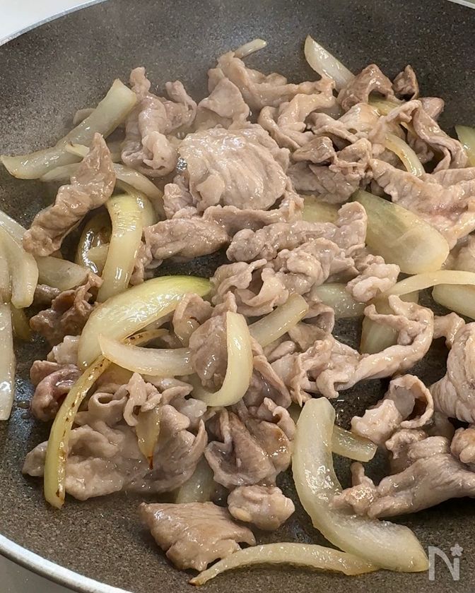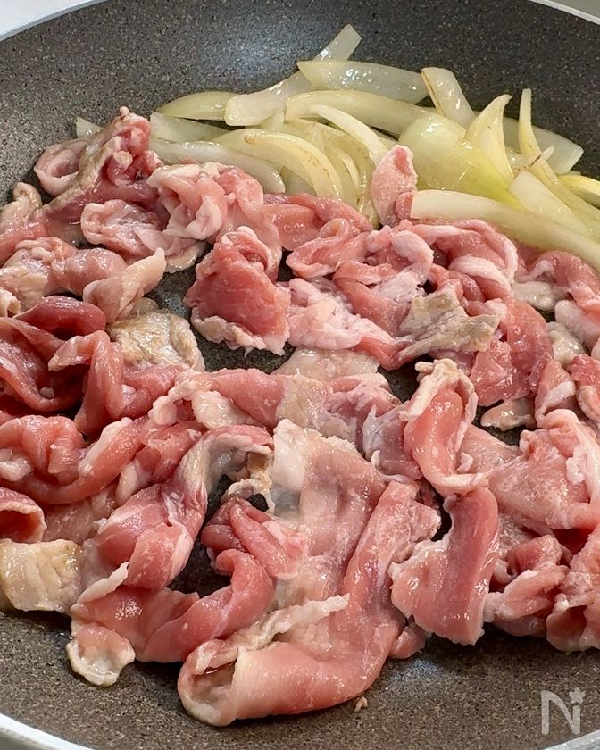 (2) あいたスペースに豚こま切れ肉を広げ入れ、焼き色がつくまで焼く。上下を返し、火が通るまで加熱する。