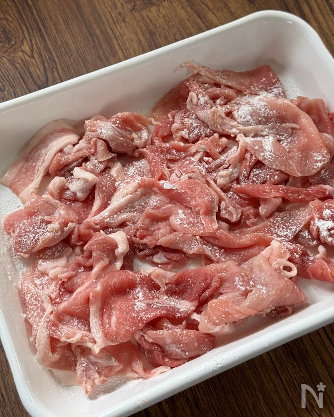 (下準備) ・豚こま切れ肉は食べやすい大きさに切り、酒をもみ込んで約2分おく。全体に薄力粉を薄くまぶす。