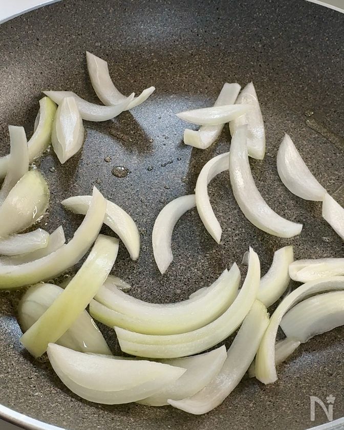(1) フライパンにこめ油を中火で熱し、玉ねぎを炒める。油がまわってしんなりしてきたら、フライパンの端に寄せる。