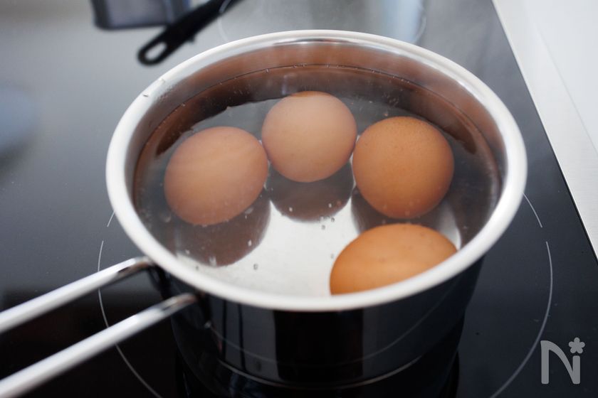 (1) 鍋に湯を沸かし、冷蔵庫から出してすぐの卵を割れないようにそっと入れて、8分茹でる。鍋から卵を取り出し、冷水で冷やしておく。