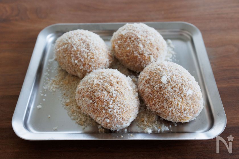 (5) 4に薄力粉(衣用)・溶き卵・パン粉をまぶす。